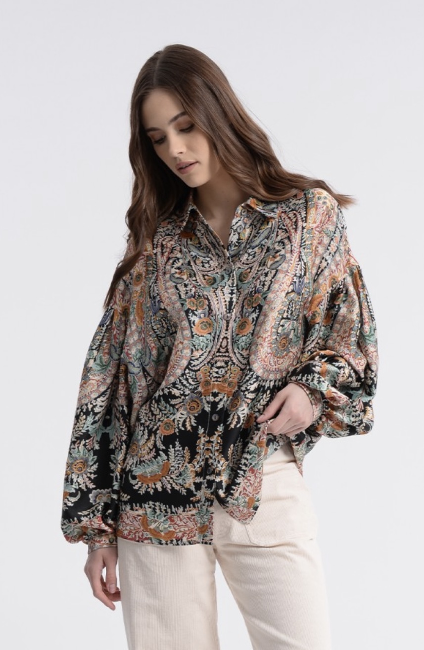 Satin shirt with baloon sleeves and intense print. It goes perfectly with your jeans or high-waisted skirt. If you want to elevate the look combine it with the pants of the same line!