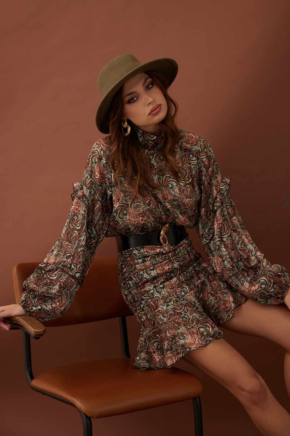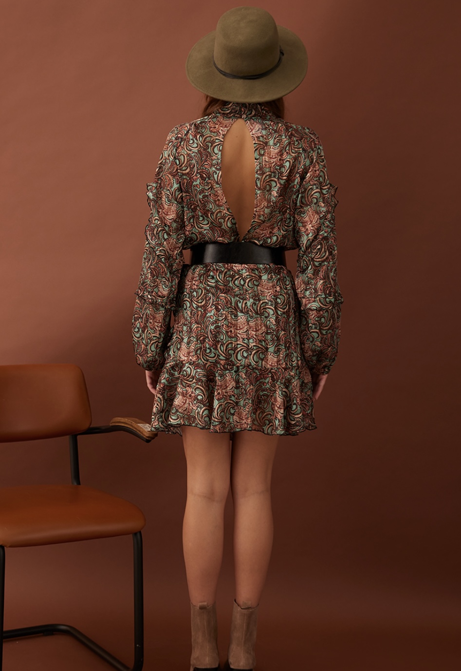 Μίνι φόρεμα με ντραπέ φούστα και άνοιγμα στην πλάτη. Έχει στενή γραμμή και έντονα μανίκια με ημιδιαφάνεια. Κλείσιμο με κουμπιά και φερμουάρ. Συνδύασε το με ένα ζευγάρι suede μπότες και μία ζώνη στη μέση!