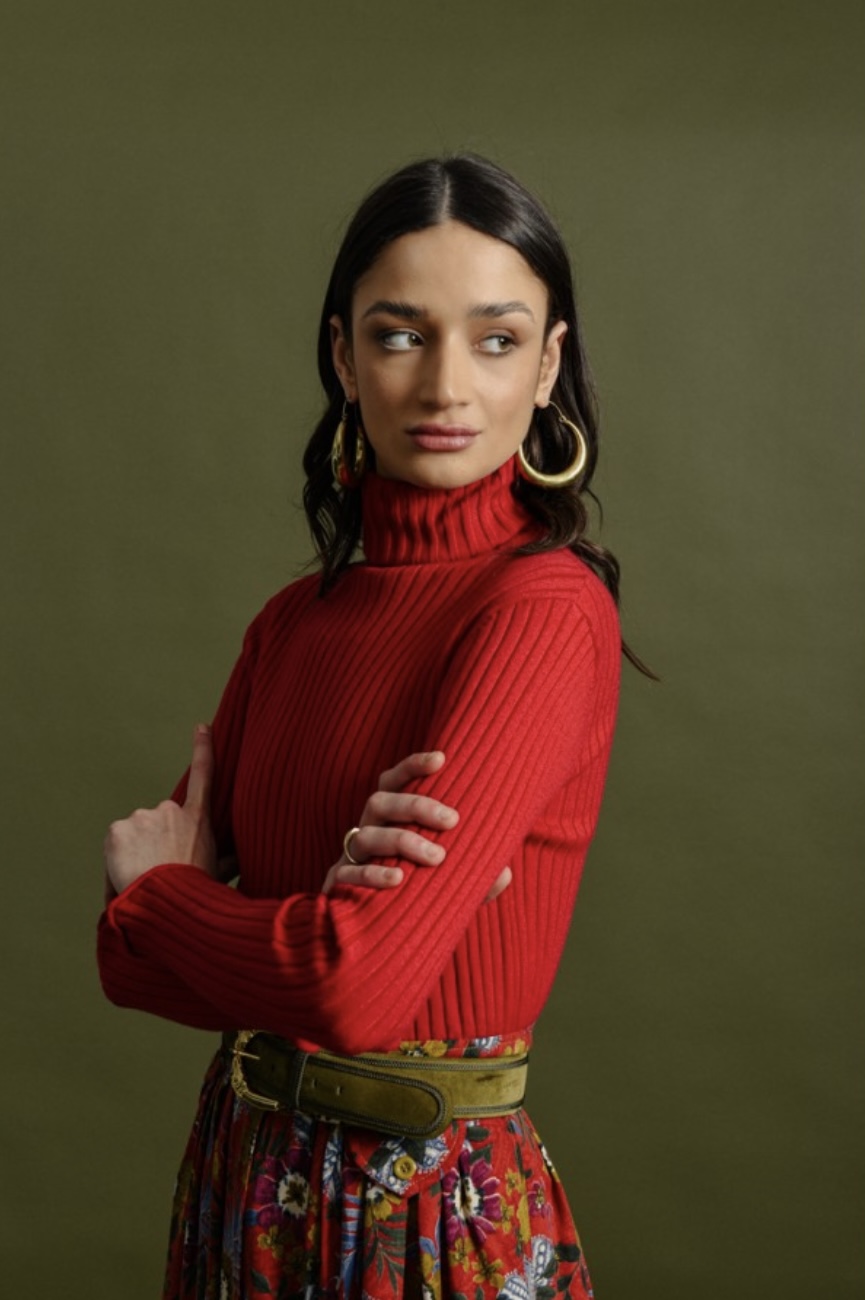Ribbed knitted turtleneck blouse in perfect red color.